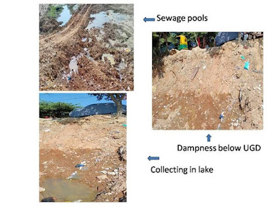 The sandbags remained in place and dry though the seepage from below the pipes increased as did the water level in the lake! In just four days, i.e., by Sunday 7th Feb., many of the pools had not only grown but, they and the trenches dug by the excavators had vile, floating mass which was visible from a distance. We knew only too well just what it was - sewage. Once again.